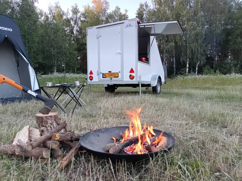 De CarpoBoxio is een slimme uitbreiding op onze populaire Carpo I. Wat deze mini-caravan uniek maakt, is de multifunctionele zijklep. Deze dient niet alleen als handige luifel, maar biedt ook plaats aan drie Boxio-kisten waarin je kunt koken, water kunt tappen en een koelbox met snijplank kwijt kunt. Ideaal voor wie offgrid wil kamperen, zonder in te leveren op comfort.