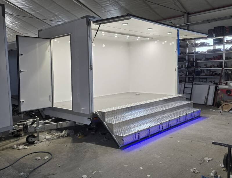 Openslaande voorzijde met trap: De brede lichtgewicht trap is voorzien van gasveren en biedt een gemakkelijke toegang tot de showroom.
